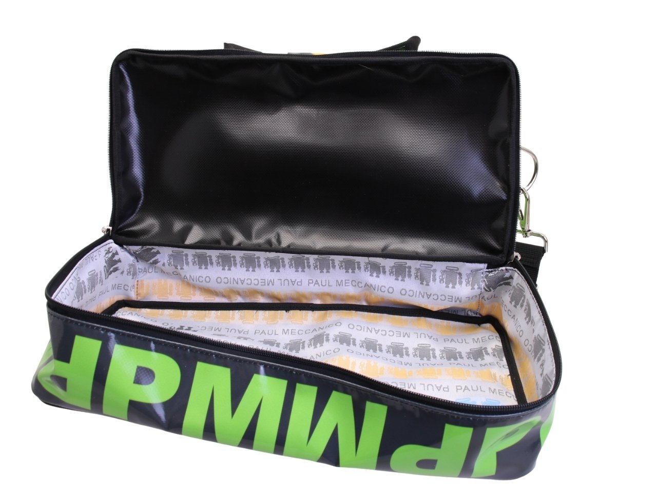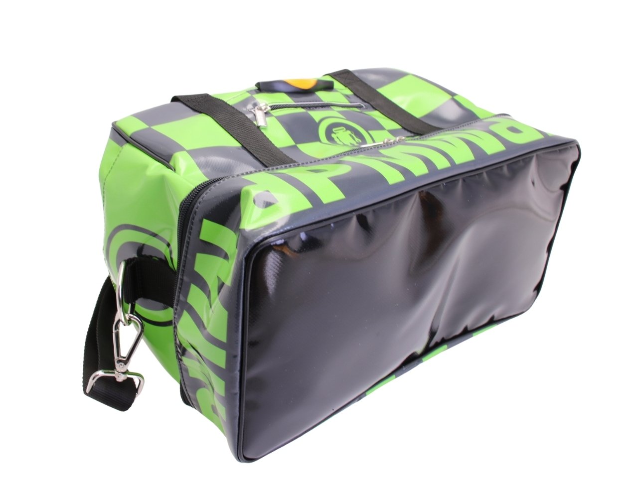 BLACK AND GREEN HAND LUGGAGE BAG 40 X 20 X 25 CM. MODEL FLYME MADE OF LORRY TARPAULIN.