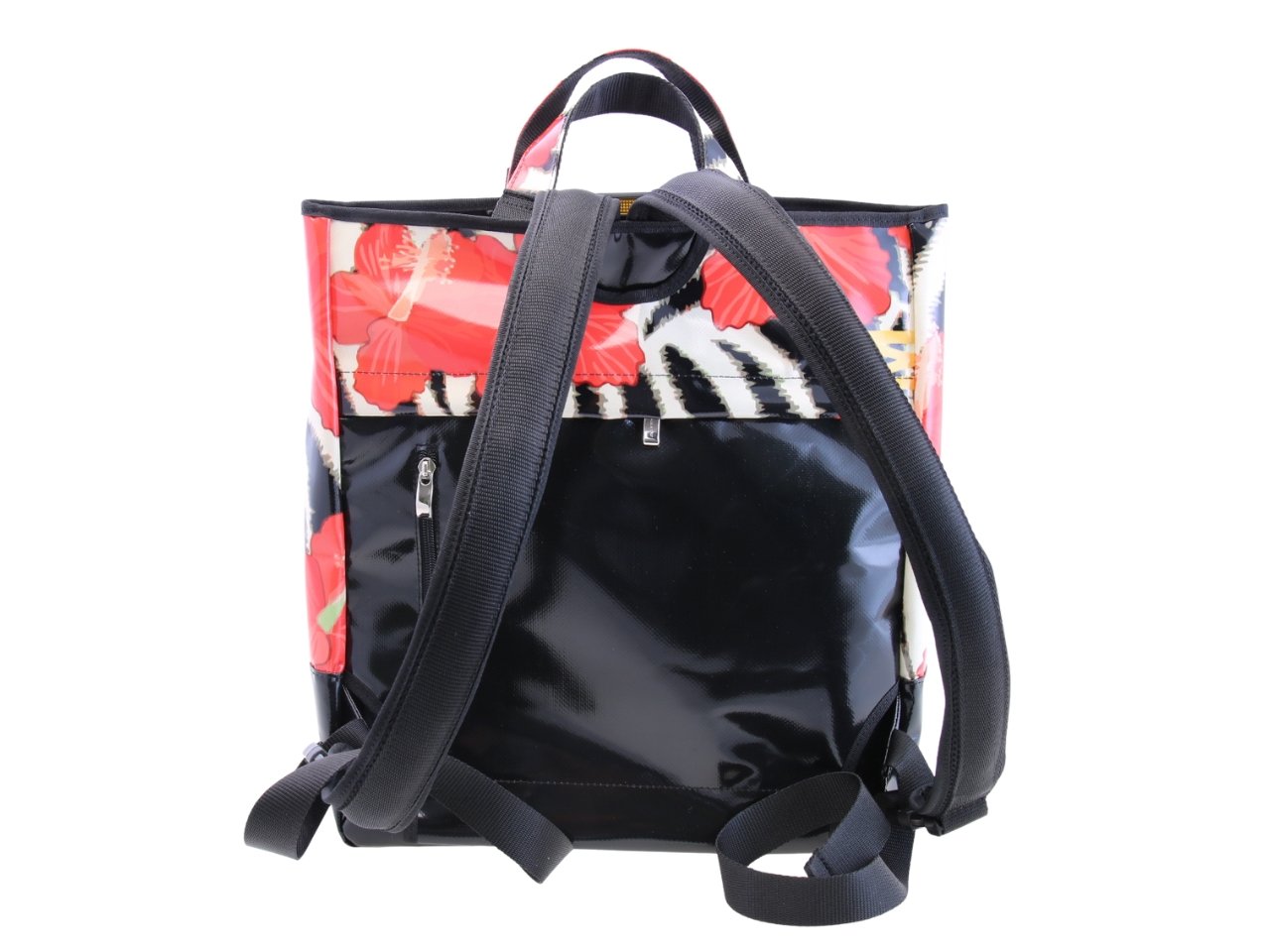 2 IN 1 BRIEFCASE AND BACKPACK WITH FLORAL FANTASY. MODEL HYBRID MADE OF LORRY TARPAULIN.