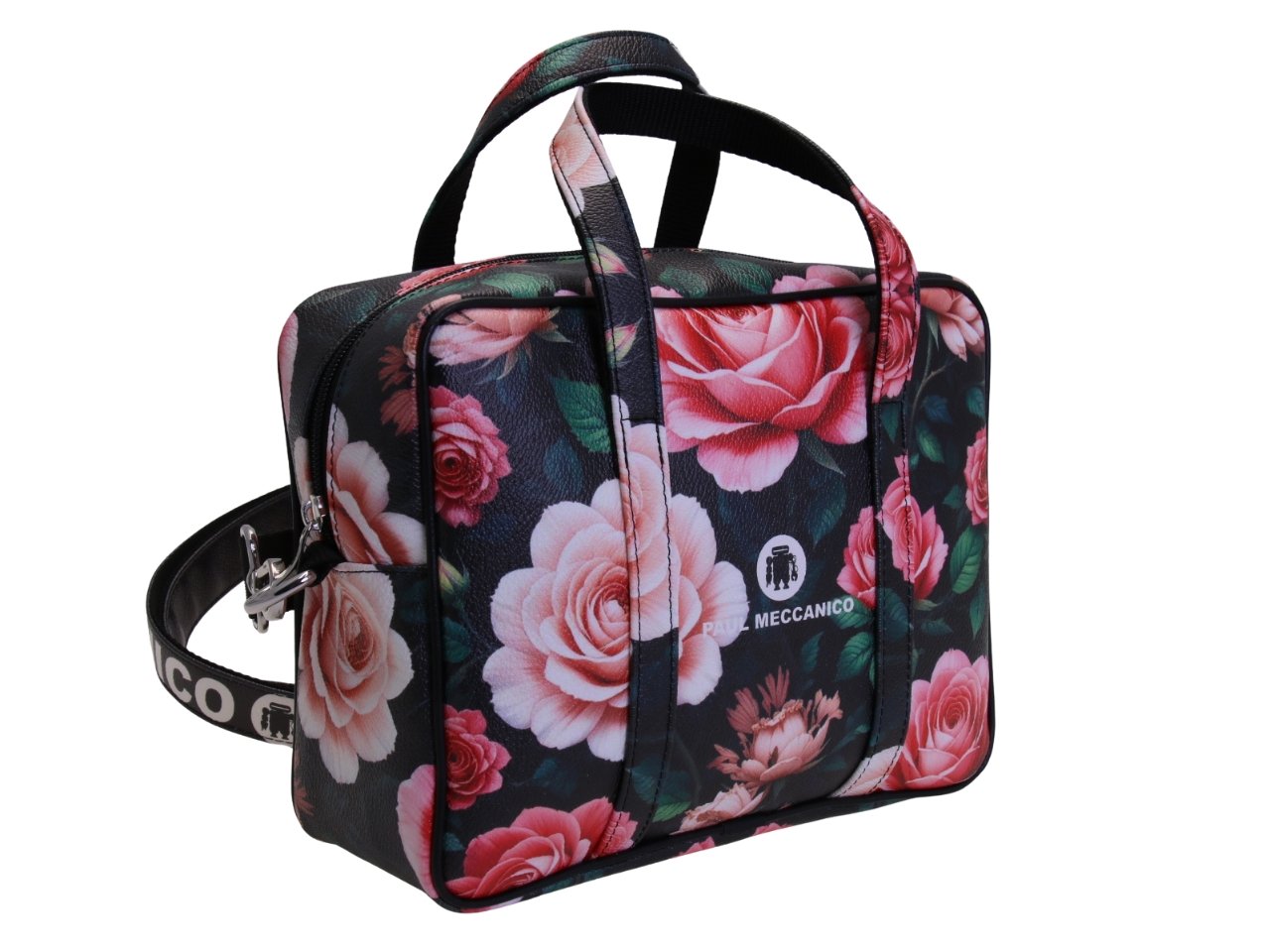 BLACK RECTANGULAR WOMEN’S BAG WITH FLORAL FANTASY. MODEL PINCA MADE OF HAMMERED SYNTHETIC LEATHER.