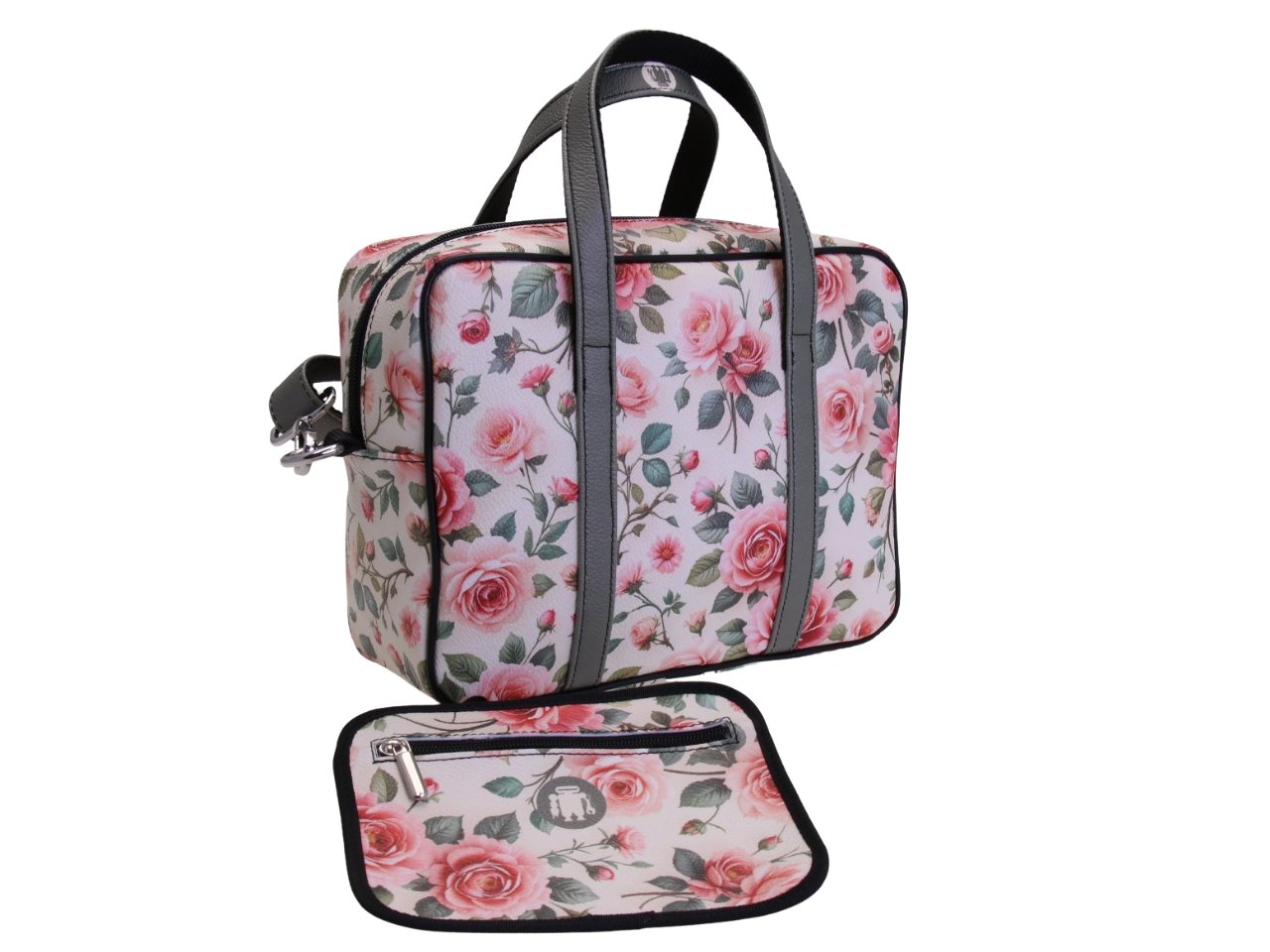 WHITE RECTANGULAR WOMEN’S BAG WITH FLORAL FANTASY. MODEL PINCA MADE OF HAMMERED SYNTHETIC LEATHER.