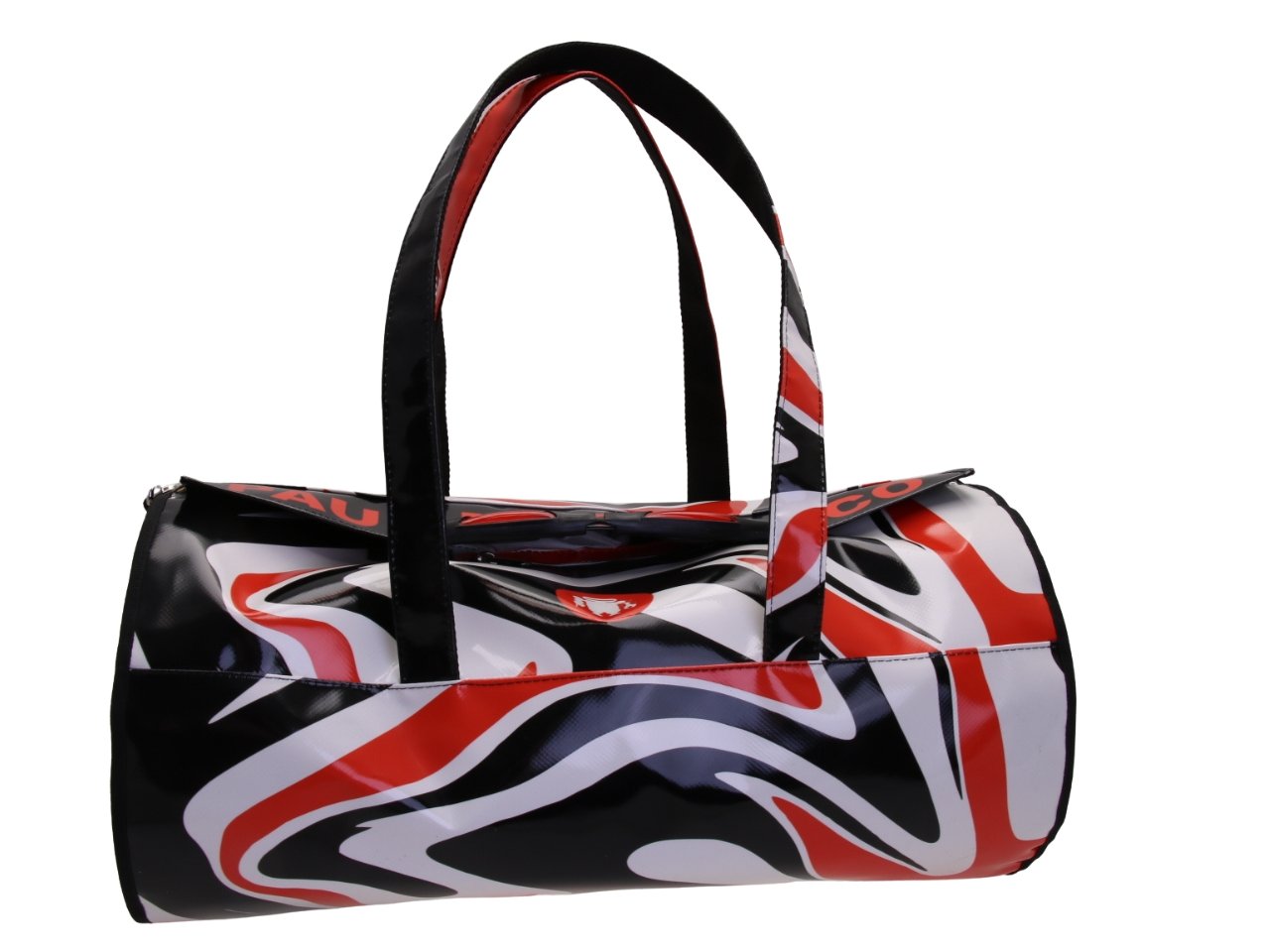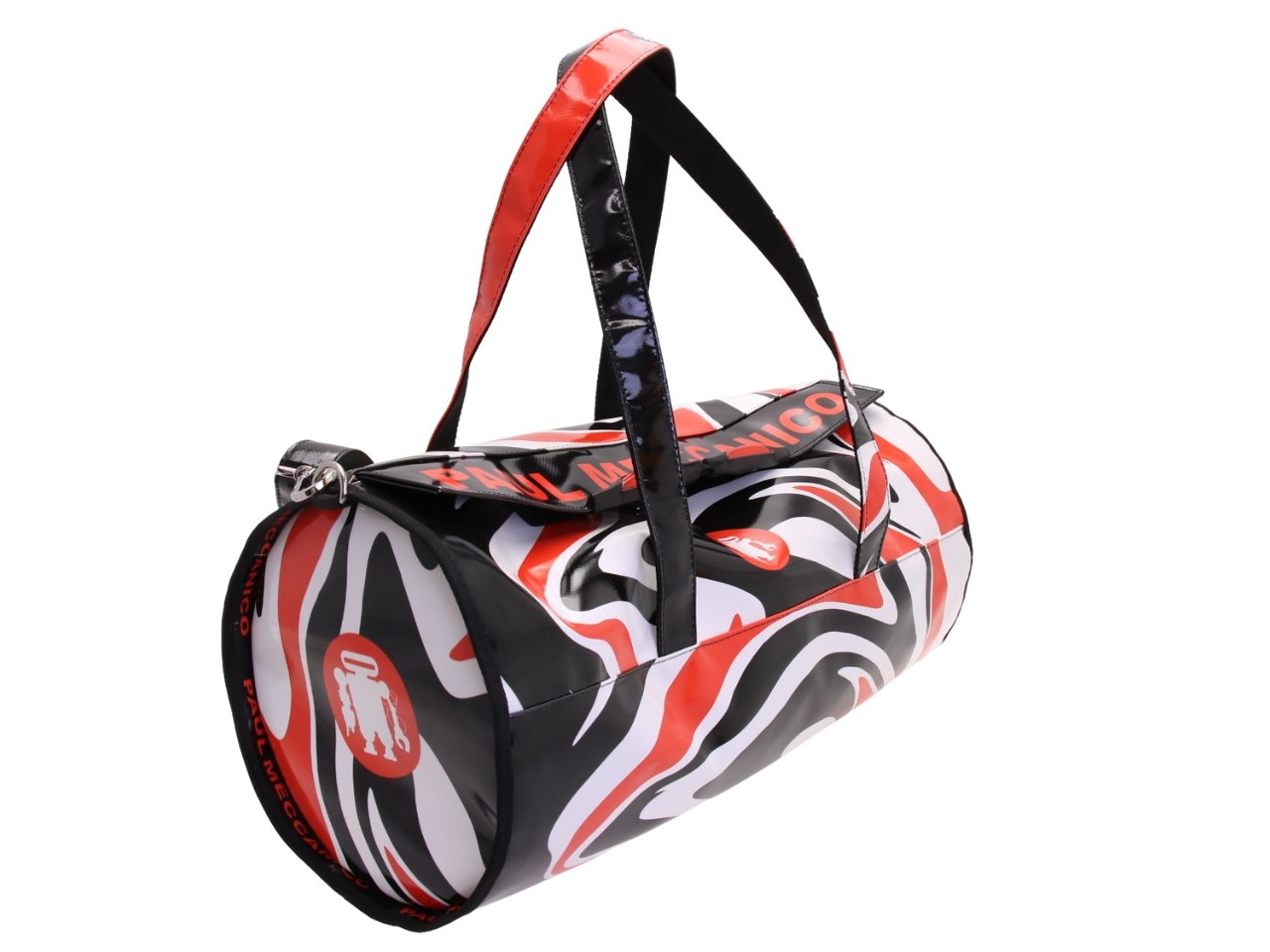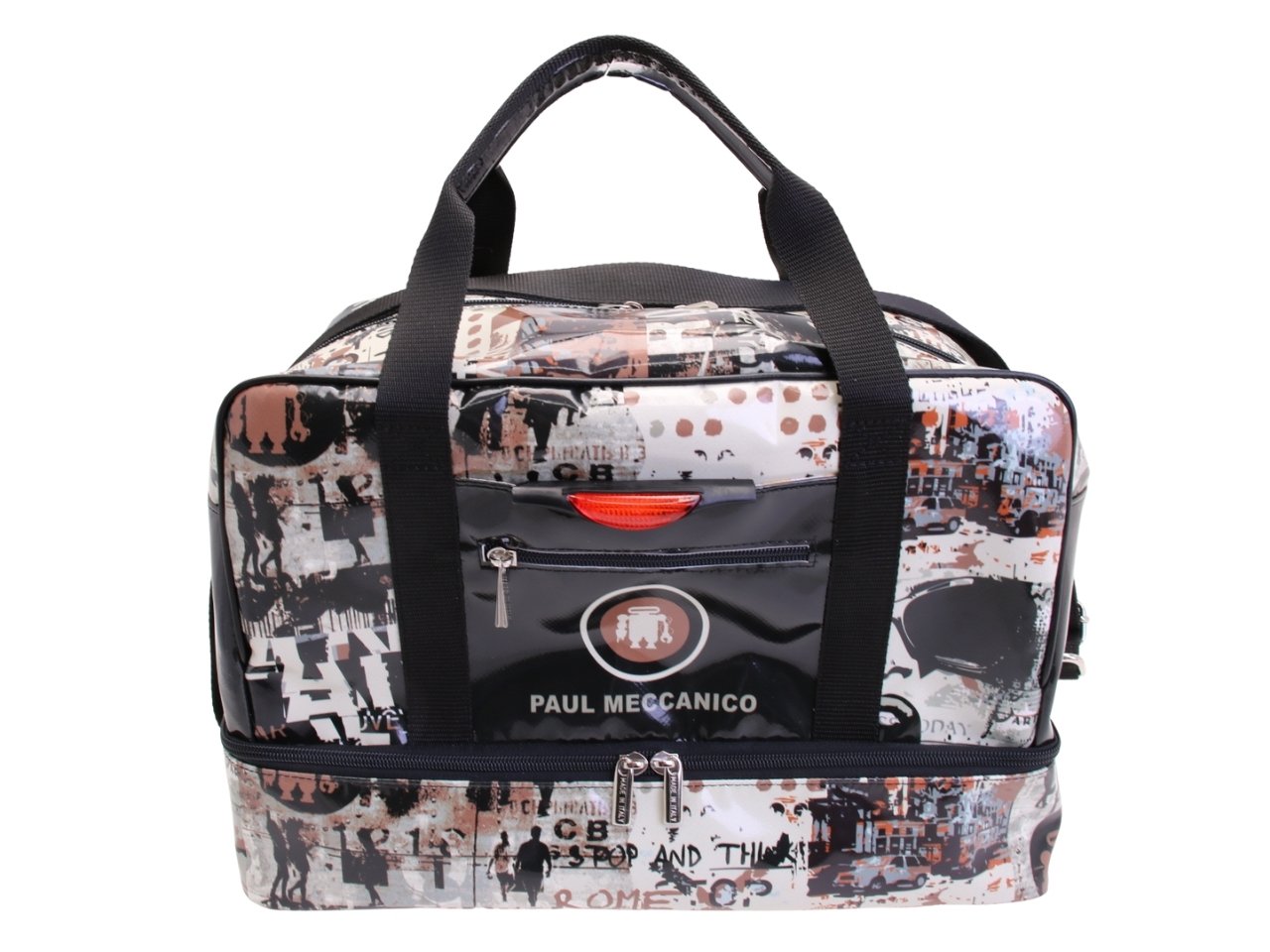 BLACK AND BEIGE HAND LUGGAGE BAG WITH “GRAFFITI STYLE” 40 X 20 X 25 CM. MODEL FLYME MADE OF LORRY TARPAULIN.