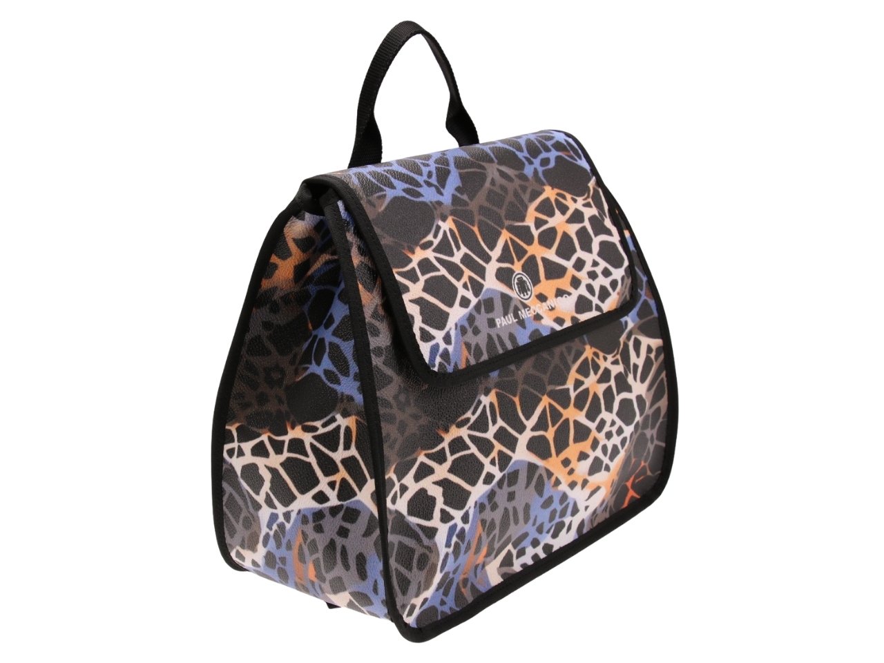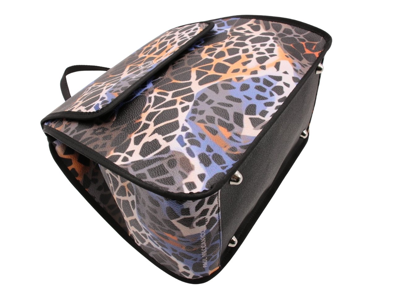 BLACK AND WHITE WOMEN’S “BACK BAG” WITH ANIMALIER FANTASY. MODEL PULP MADE OF LORRY TARPAULIN.